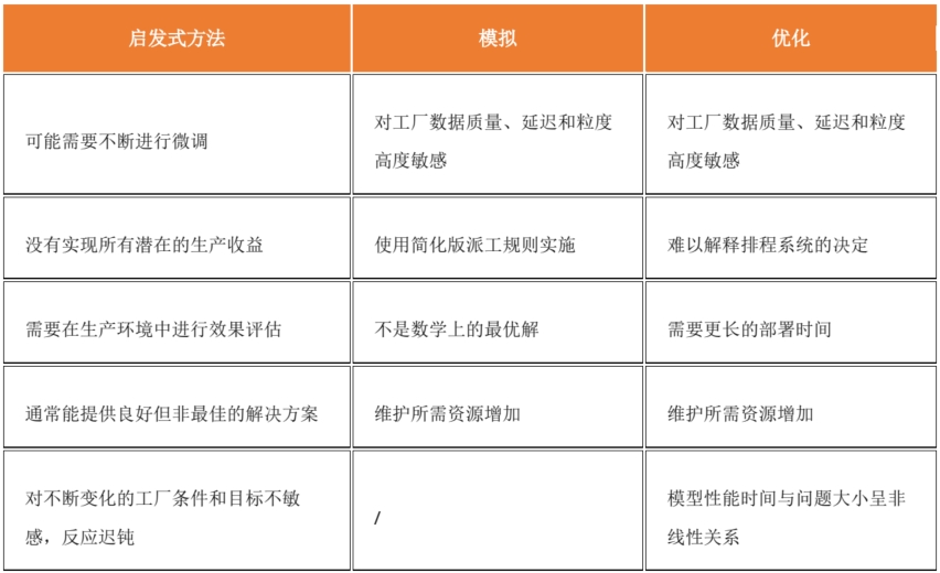 表 3:启发式、模拟和优化的排程解决方案的局限性
