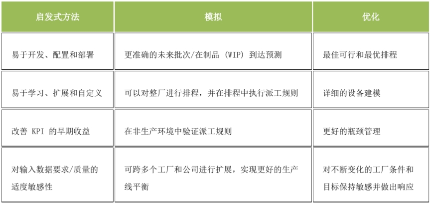 表 2:基于启发式、模拟和优化的排程解决方案的积极属性